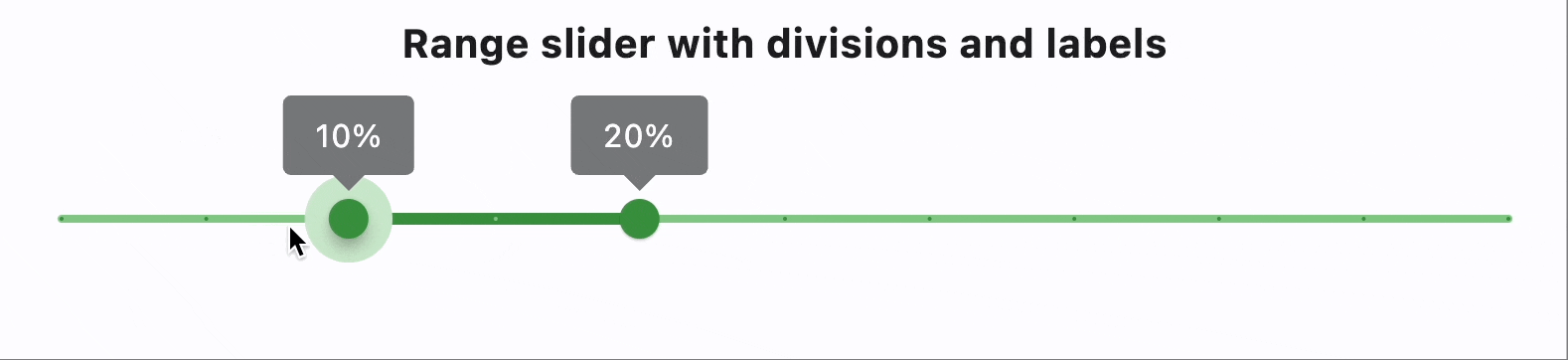A Material Design range slider. Used to select a range from a range of values. A range slider can be used to select from either a continuous or a discrete set of values. The default is to use a continuous range of values from min to max.