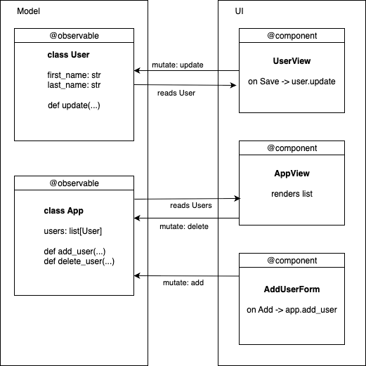 that return a view of the current state. Each row decides whether to show a read-only view or an inline editor using its own short-lived, local values (hooks), while the durable data lives on the model objects. Event handlers update state only (e.g., modify a user or add/remove items), not the controls themselves; Flet detects those changes and re-renders the affected parts. In short: UI = f(state), with User