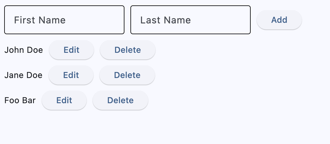 The behavior in both examples stays the same - in the app you can see the list of users, add user, inline edit with save/cancel buttons and delete. This is how this simple app looks in boths examples: