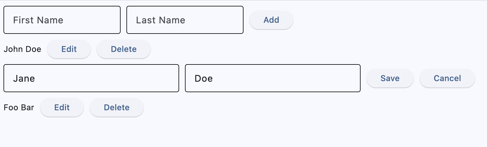 to push those visual changes. Edit hides the read-only label and action buttons, shows inputs and Save/Cancel; Save copies text field values back into the label and restores the original view; Cancel just restores the original view; Delete removes the whole row from the page. In short, behavior is implemented by mutating controls and manually triggering re-renders, not by evolving a separate state model.